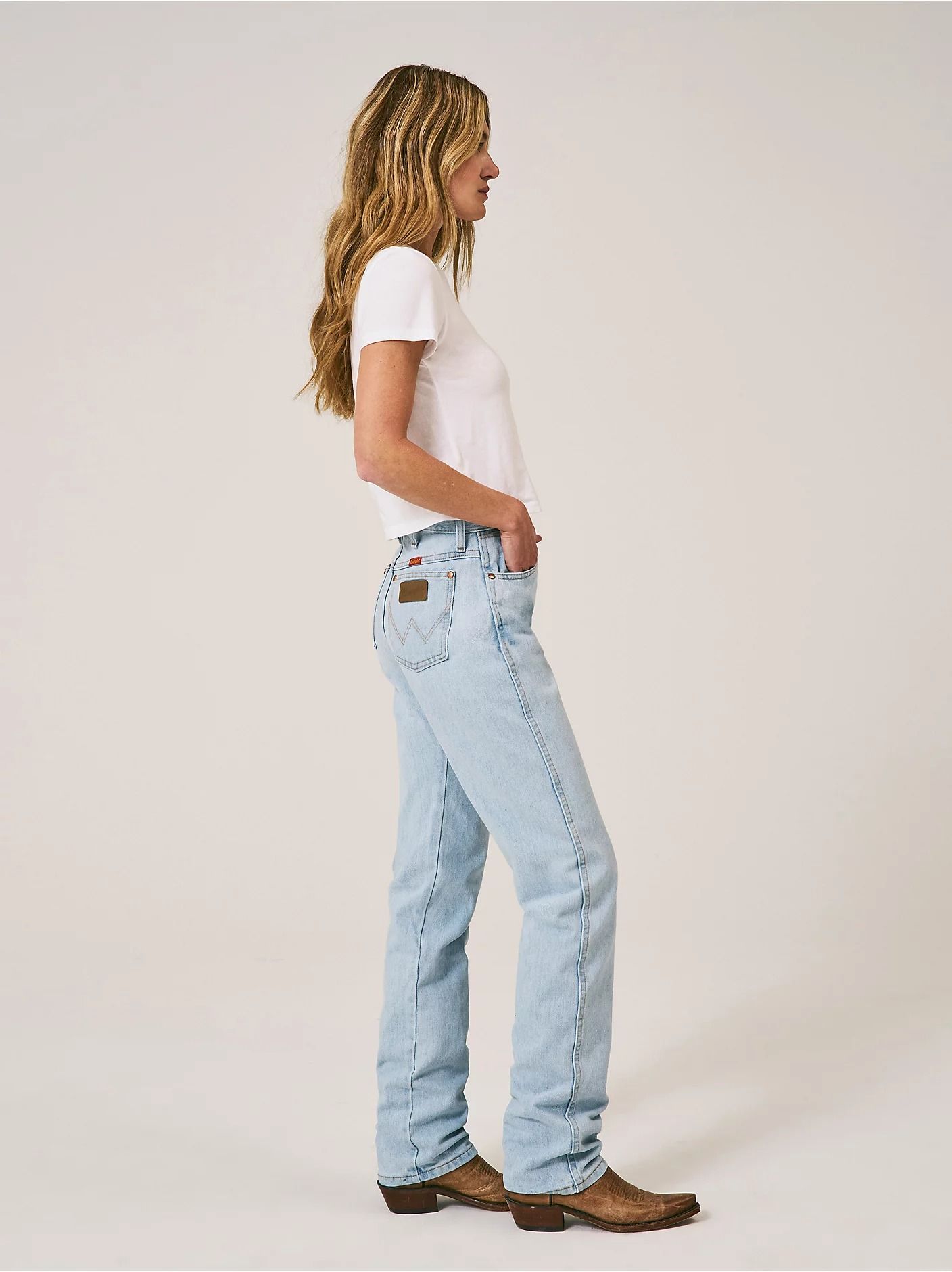 ЦветBleachХарактеристика ткани100% хлопок индиго деним, ломаная саржа (ёлочка), плотность 15.25 Oz.Кройузкий (slim fit)Крой от коленапрямые (straight leg)Посадка на талиивысокая (high rise)ЗастёжкамолнияКарманы5 без застёжекЗаклёпкина всех карманахБрендWranglerКоллекцияCowboy Cut®ПроизводительKontoor Brands Inc. -