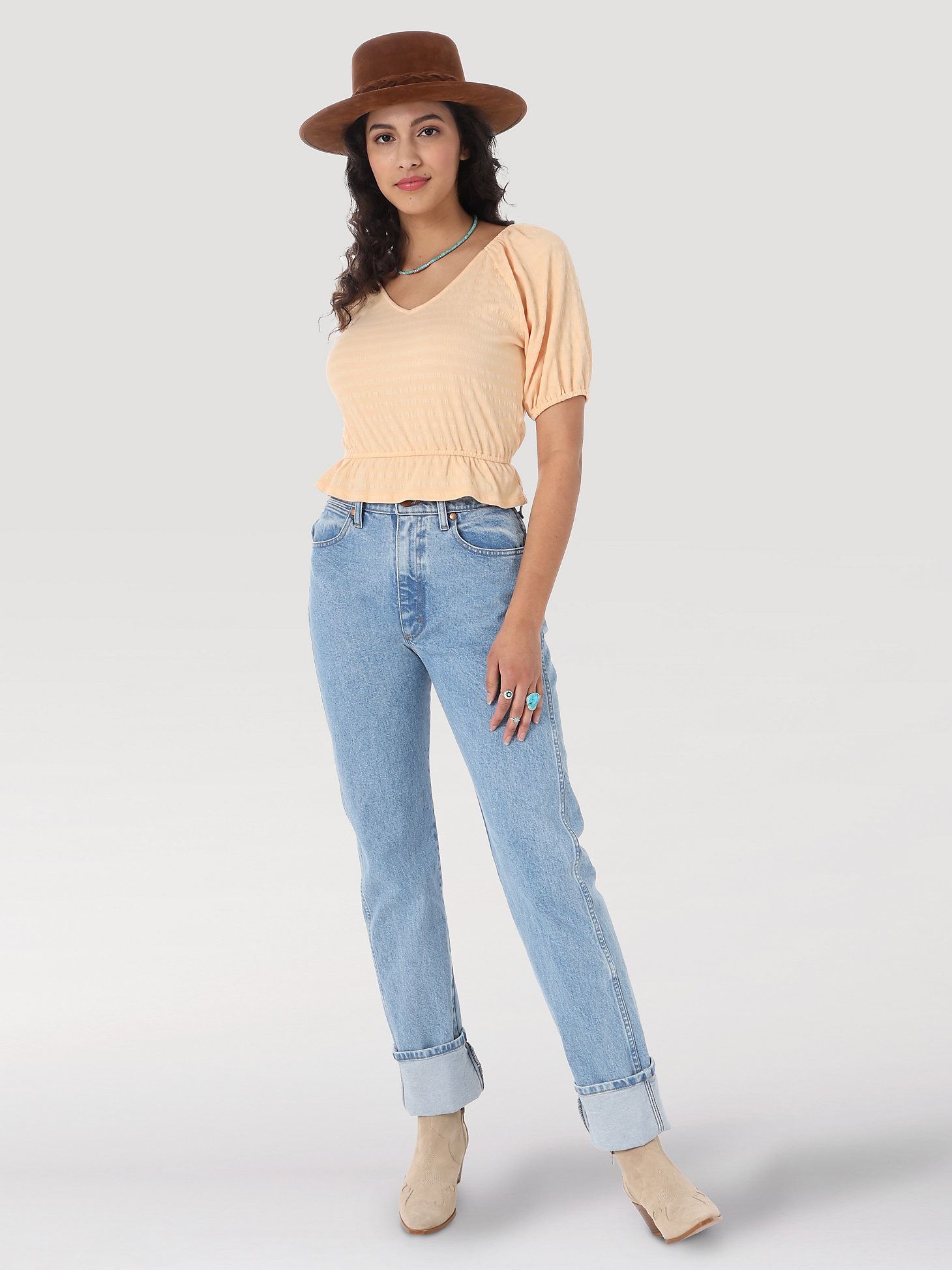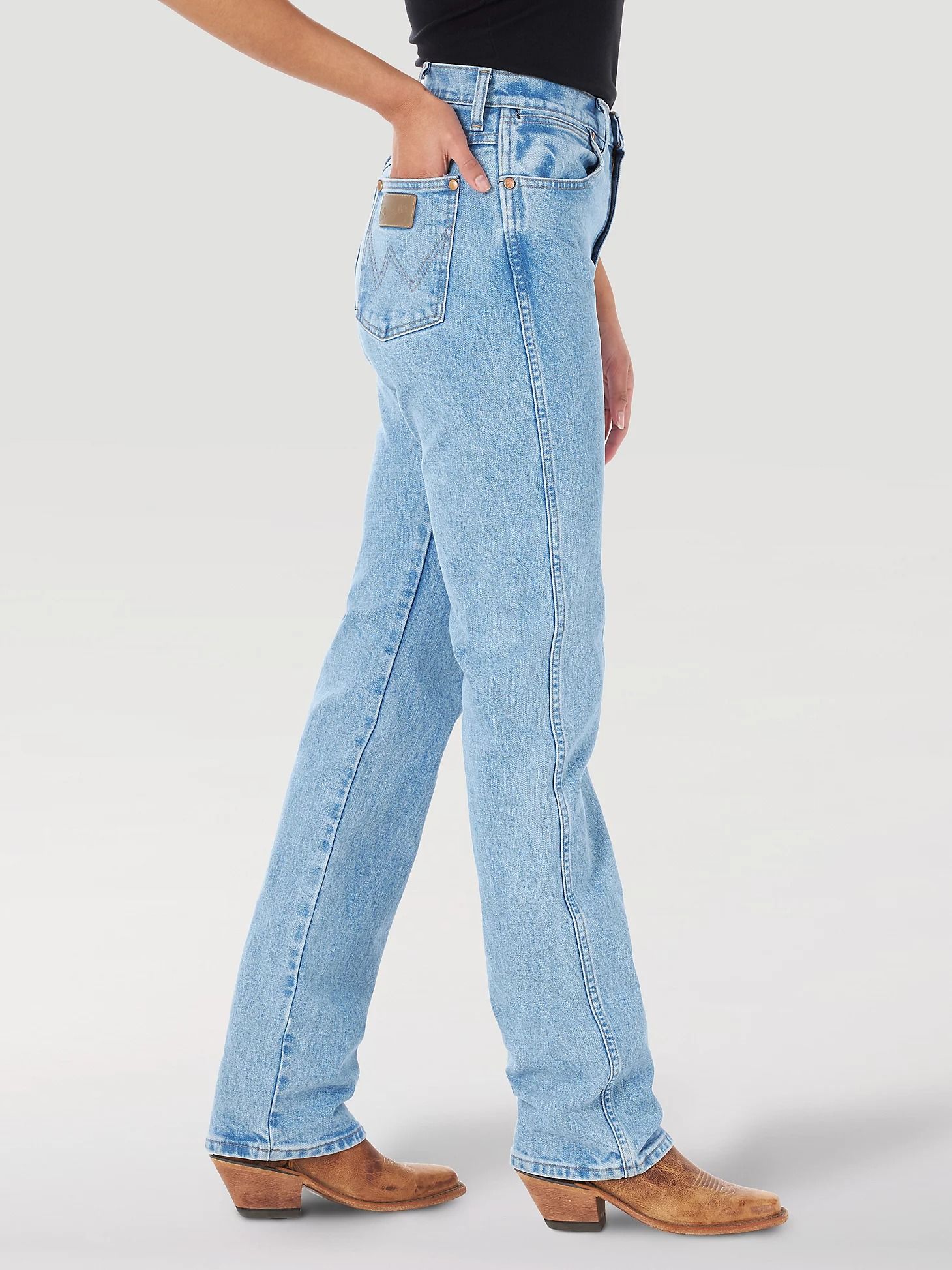 Wrangler Cowboy Cut это икона стиля одежды Вестерн. Джинсы сконструированы на основе консультаций с ведущими атлетами Родео, учитывающих особенности движения и нагрузок спортсменов, участвующих в соревнованиях. Движения, которые осуществляет спортсмен при активной езде на лошади, наложили свой отпечаток на конструкцию этой модели. Это тяжёлая, прочная ткань, заклёпки на всех карманах, мощный двойной шов и высоко сидящие задние карманы.
