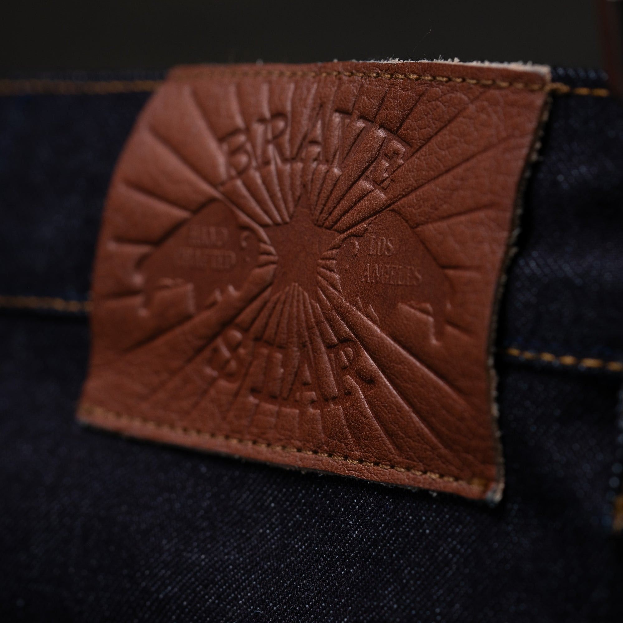 - Лэйбл из натуральной, толстой бычьей кожи, отштампован в Лос-Анджелесе, этикетка на поясе соткана там же.