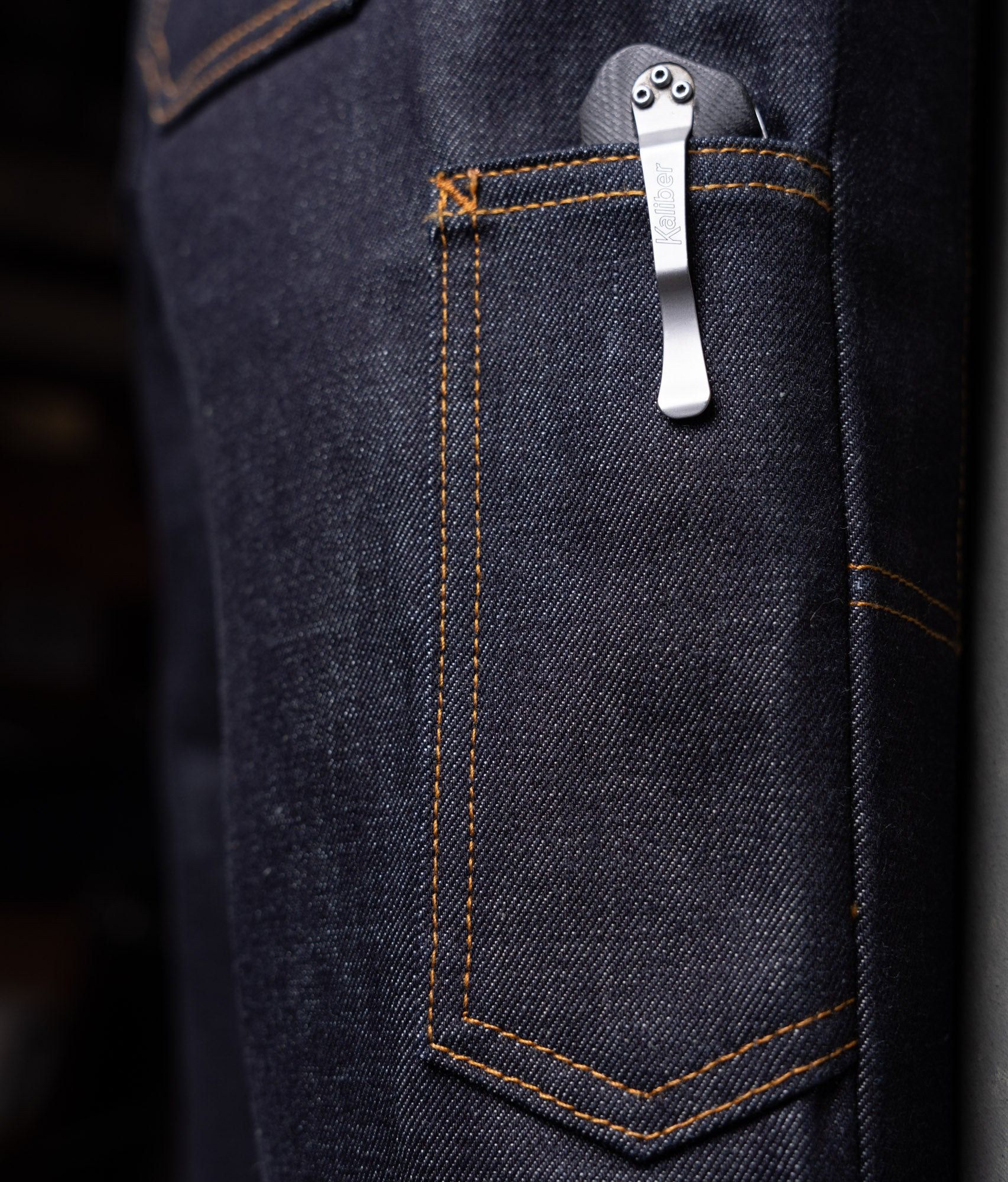 Кольцевая пряжа, которая создает природную текстуру как в основе, так и в утке, имеет тот грубый, суровый характер, который со временем становится только лучше. Узелки и впадинки на ткани дадут со временем благородную патину, которая расскажет историю Вашей жизни, за один взгляд. При среднем весе в 14 унций, ткань достаточно тяжела, чтобы не просто казаться весомой, но и не будет тяготить вас своей жёсткостью — штаны созданы для круглогодичного ношения. Край полотна завершён привычной красно-оранжевой строчкой, характерной для эпохи классической рабочей одежды - культовым идентификатором - красной каймой, отметкой, достижимой только на старинном, узком челночном ткацком станке. Никаких уловок, никаких компромиссов — просто чертовски хороший деним.