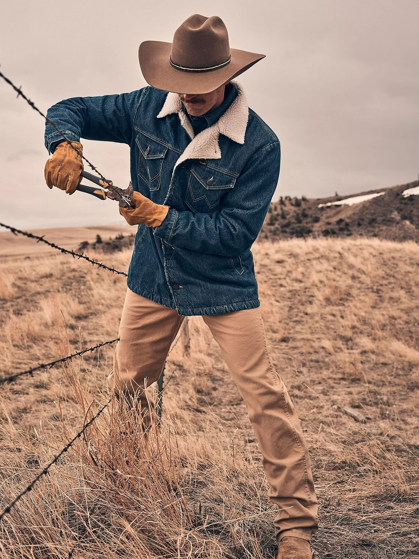 ЦветMedium WashХарактеристика такани100% хлопок индиго деним, диагональная саржа, 14.75 Oz.Подкладка100% Полиэстер шерпаСтильковбойскийЗастёжкапуговицыРукавдлинный, застёжка на пуговицуСилуэтпрямойКарманычетыре наружныхВоротникотложной с опушкой шерпаБрендWranglerКоллекцияCowboy Cut®ПроизводительKontoor Brands Inc. -