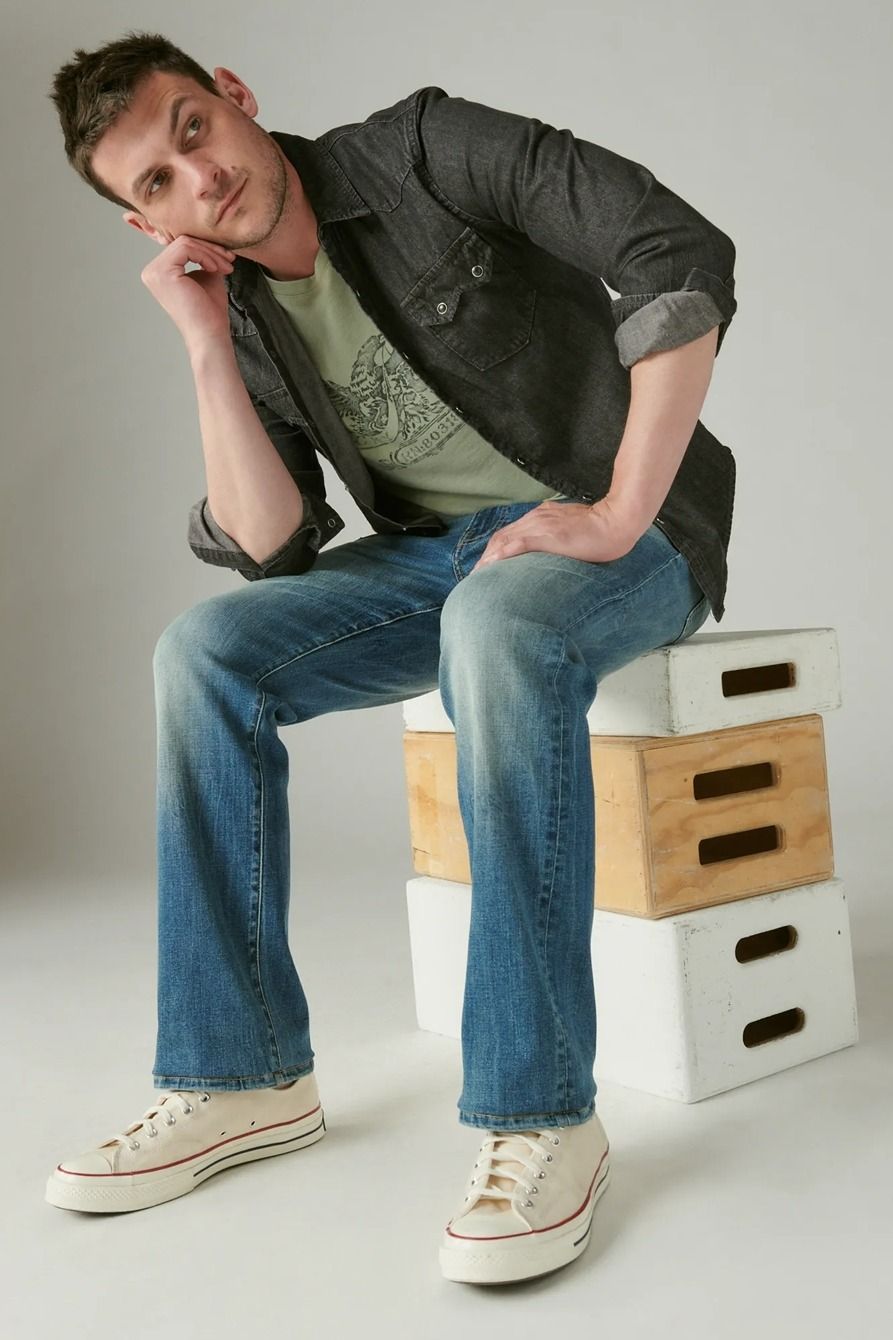 ЦветTravisХарактеристика ткани56% Хлопок 21% Полиэстер 21% Лиоцелл 2% Эластан, индиго деним, диагональ, 12 Oz.СтретчестьКройрегулярный (regular fit)Крой от коленарасширенные (bootcut)Высота посадки на талиисредняя (regular rise)ШиринкамолнияКарманы5 без застёжекЗаклёпкина передних карманахБрендLucky BrandПроизводительCatalyst Brands LLC -