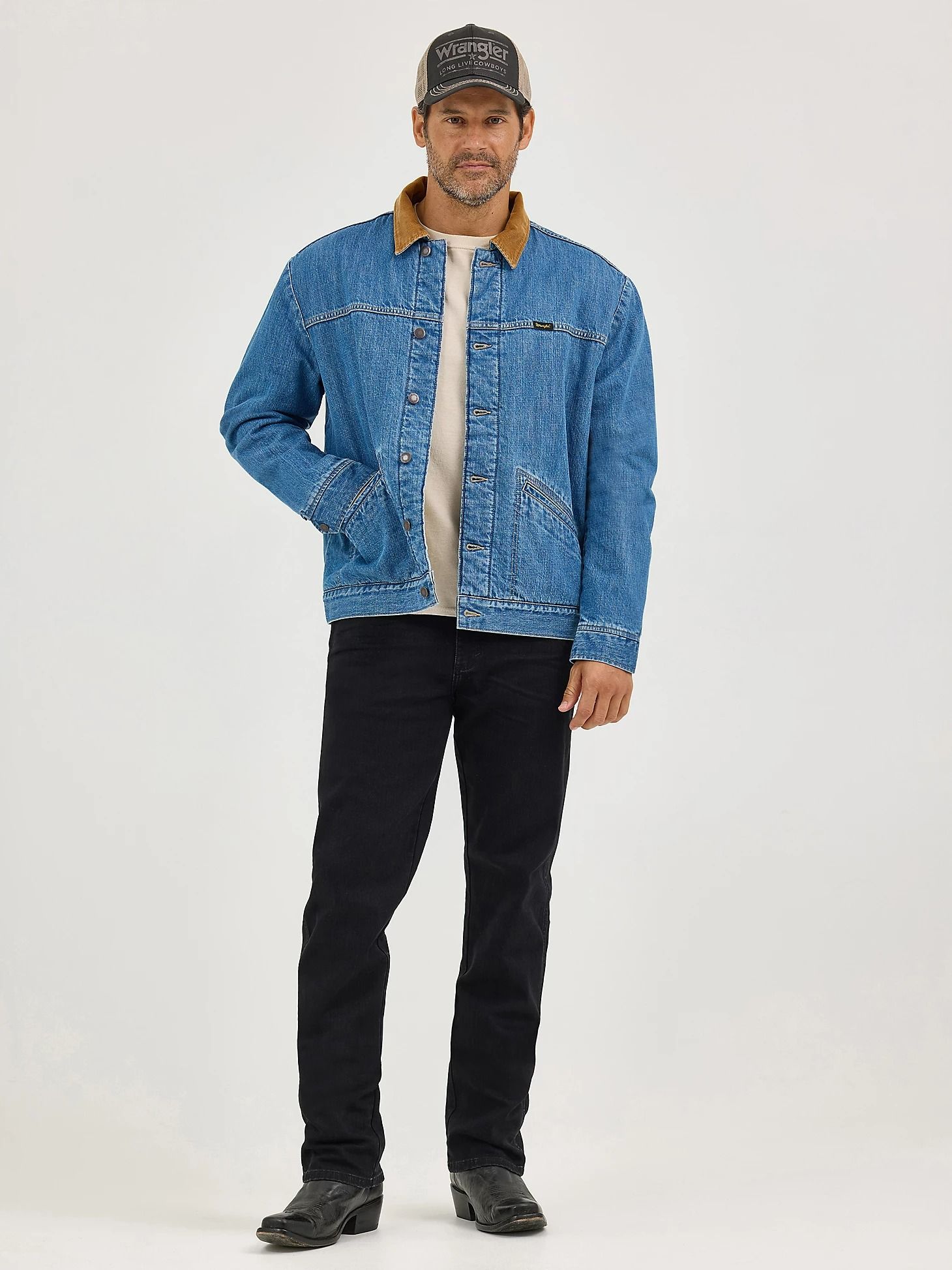 ЦветAntique IndigoХарактеристика такани100% хлопок, индиго деним, диагональная саржа, 12.5 oz.Подкладка100% Полиэстер шерпаСтильВестернЗастёжкапуговицыРукавдлинный, застёжка на пуговицуСилуэтпрямойКарманычетыре наружных, один внутреннийВоротникотложной с вельветовой накладкойБрендWranglerПроизводительKontoor Brands Inc. -
