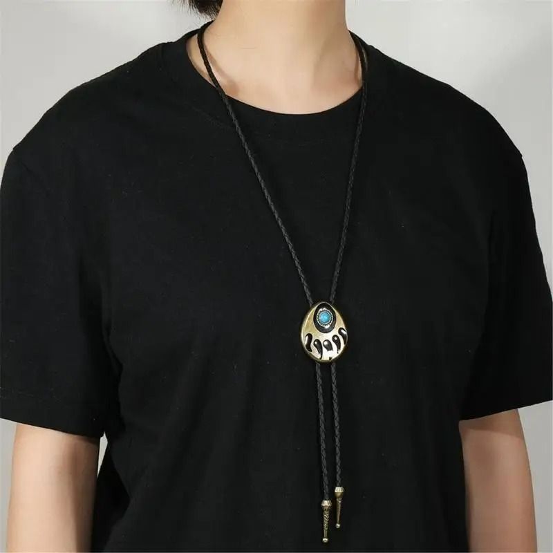 Изготовленный из сплава, этот галстук имеет плетеную вручную веревку из искусственной кожи и металлические наконечники. Украшен искусственной бирюзой. Подходит, как для мужчин, так и для женщин.