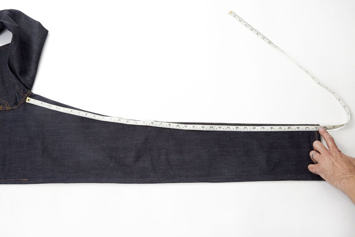 Затем, отложить от низа поясного ремешка 6 дюймов и измерить ширину штанины до срединного шва, чуть ниже строчки гульфика (так называемого J шва), с одной стороны, ...и с другой: